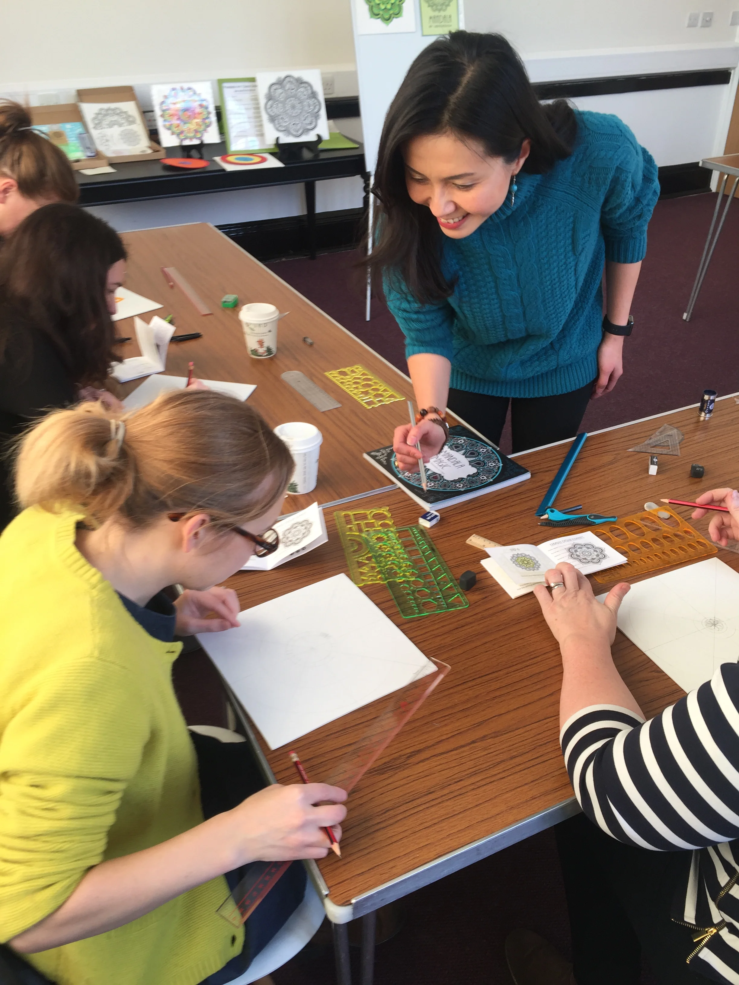 Ubie also runs regular Mandala drawing and painting workshops. The workshops teach attendees the skills and techniques to create their own beautiful Mandalas and associated designs and to paint and colour them.